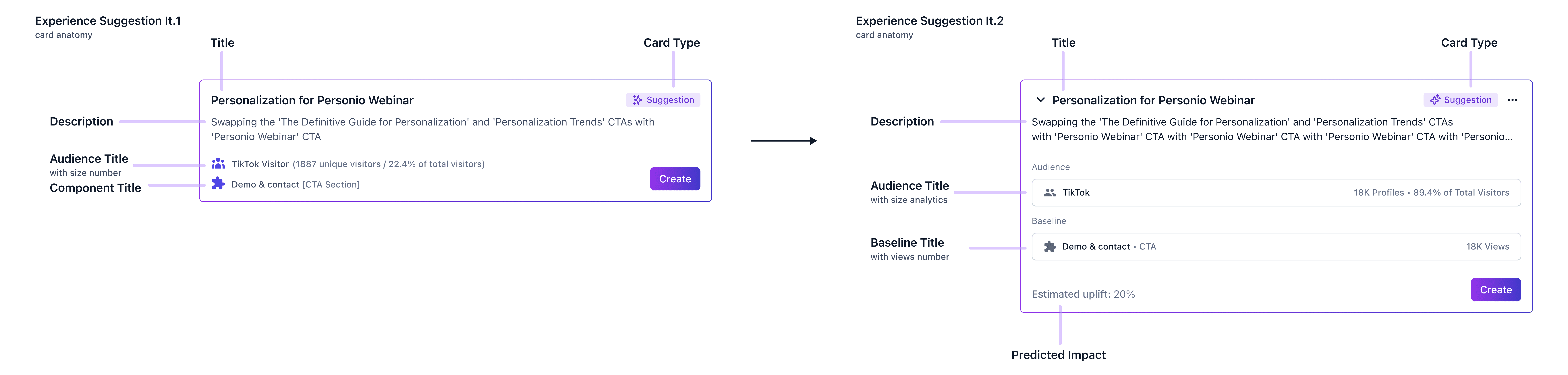 My hypothesis regarding users starting their experience creation journey at the component page was proved during the interviews and so I have placed 2nd iteration of Experience Suggestion card on both pages: Audience and Component to align with a natural users’ workflow.