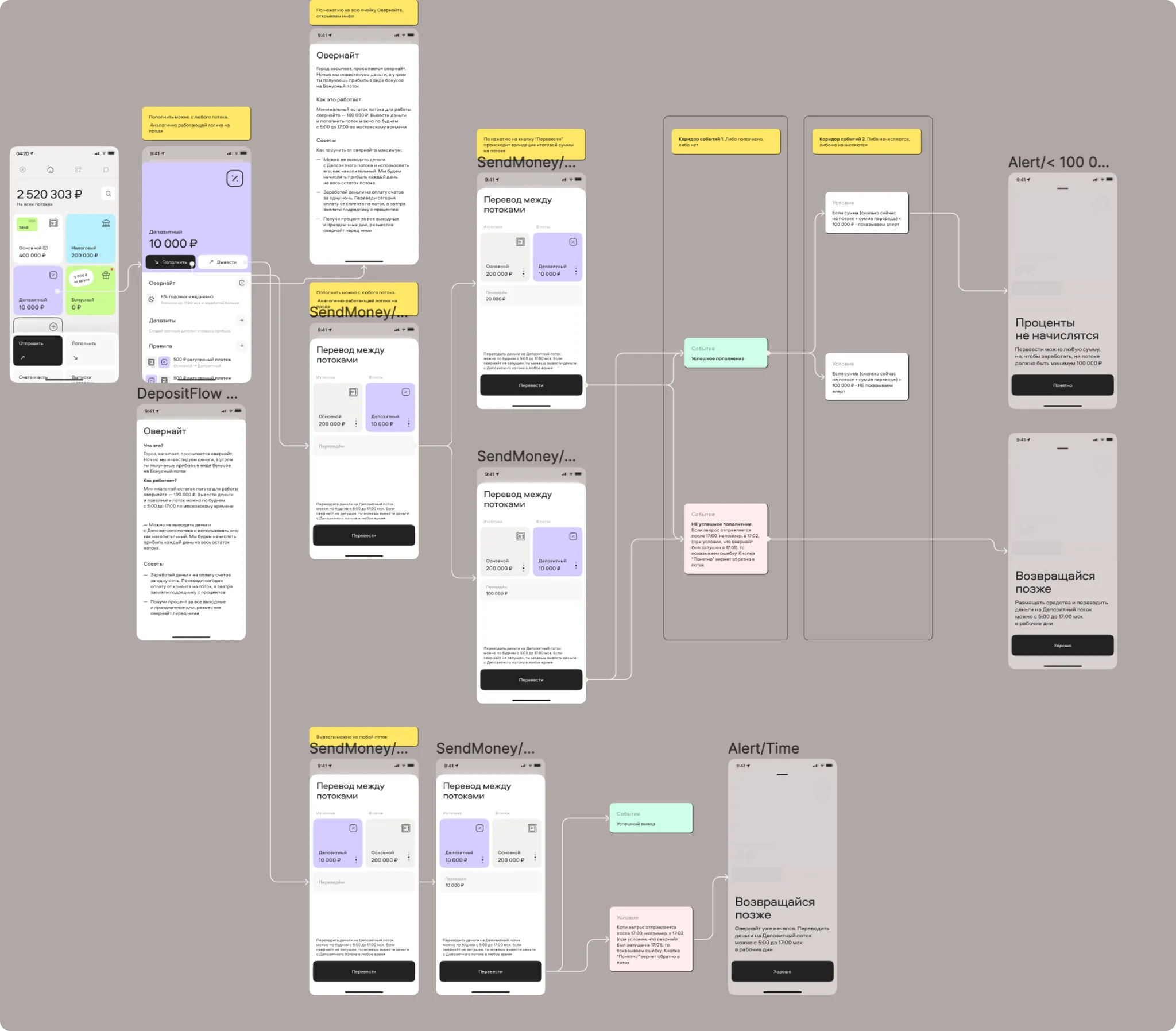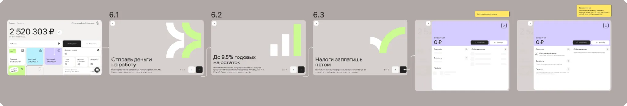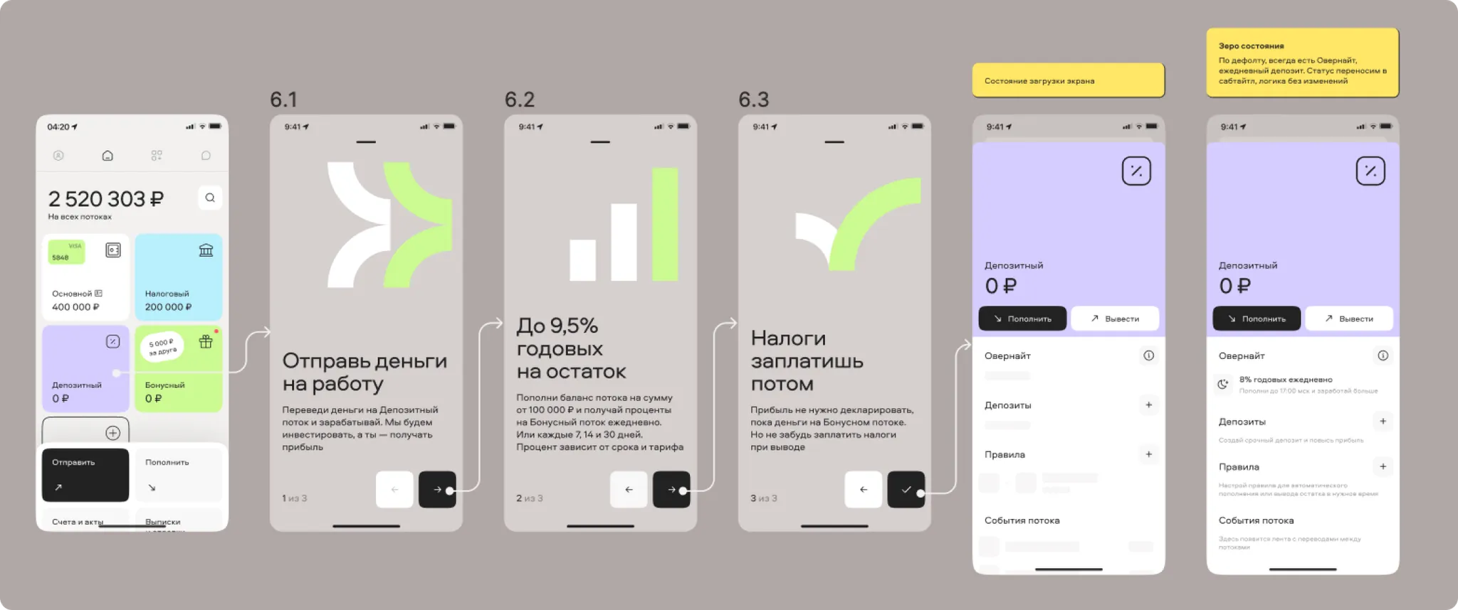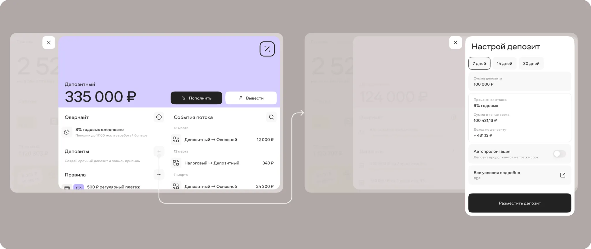 Within the “Streams” framework, I designed a new stream called “Deposit,” which automatically triggered the Overnight feature. This feature would activate if a stream held more than 100,000 rubles by 17:00 Moscow time, sending the balance to the exchange to earn interest overnight. This process was visually communicated to the user through a status called “Money is placed.” Users could withdraw or deposit money again after the overnight process completed at 5:00 AM the following day.