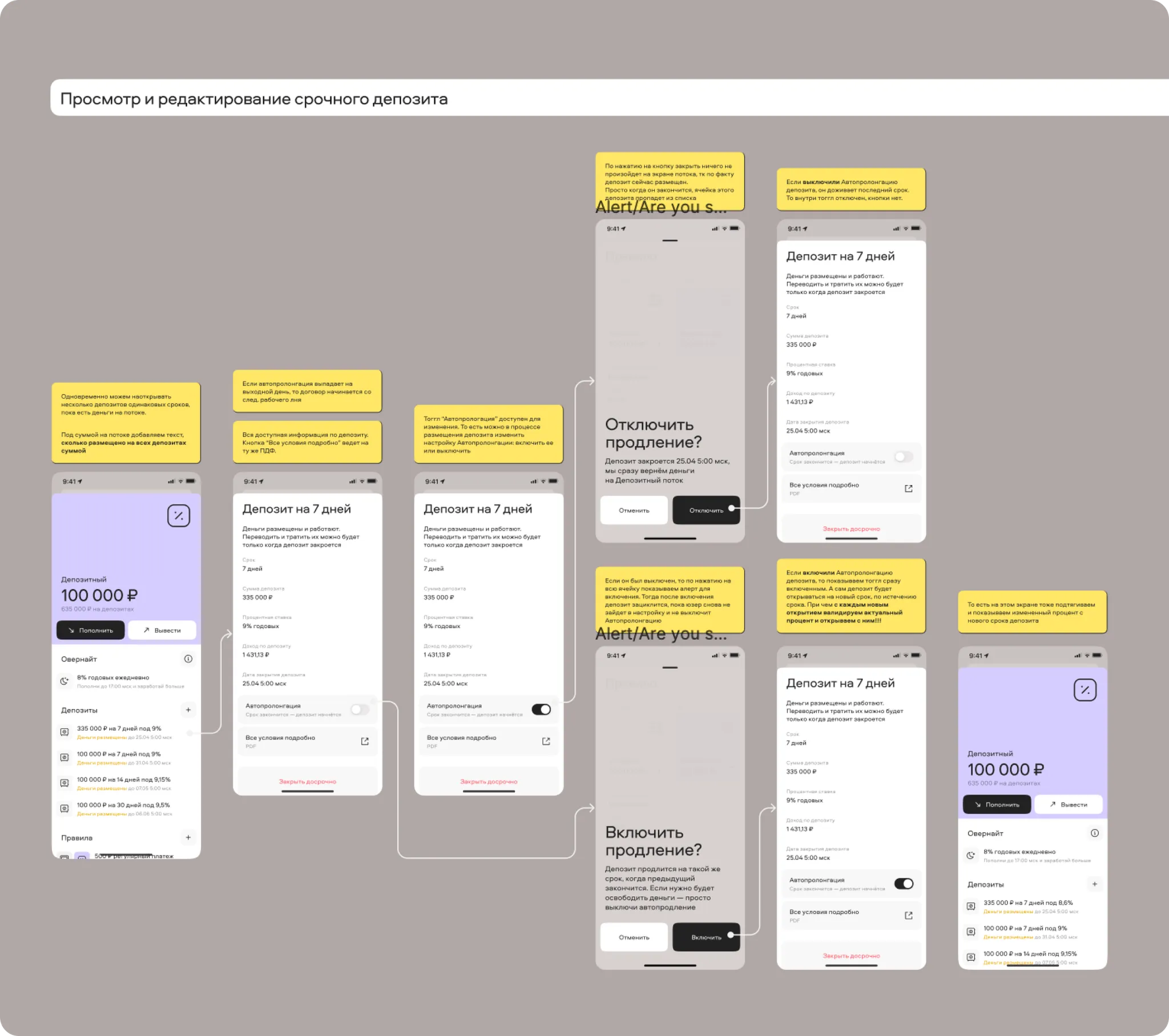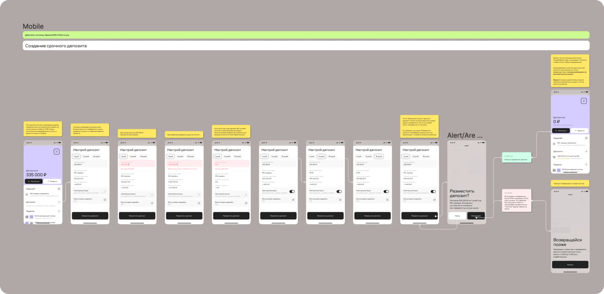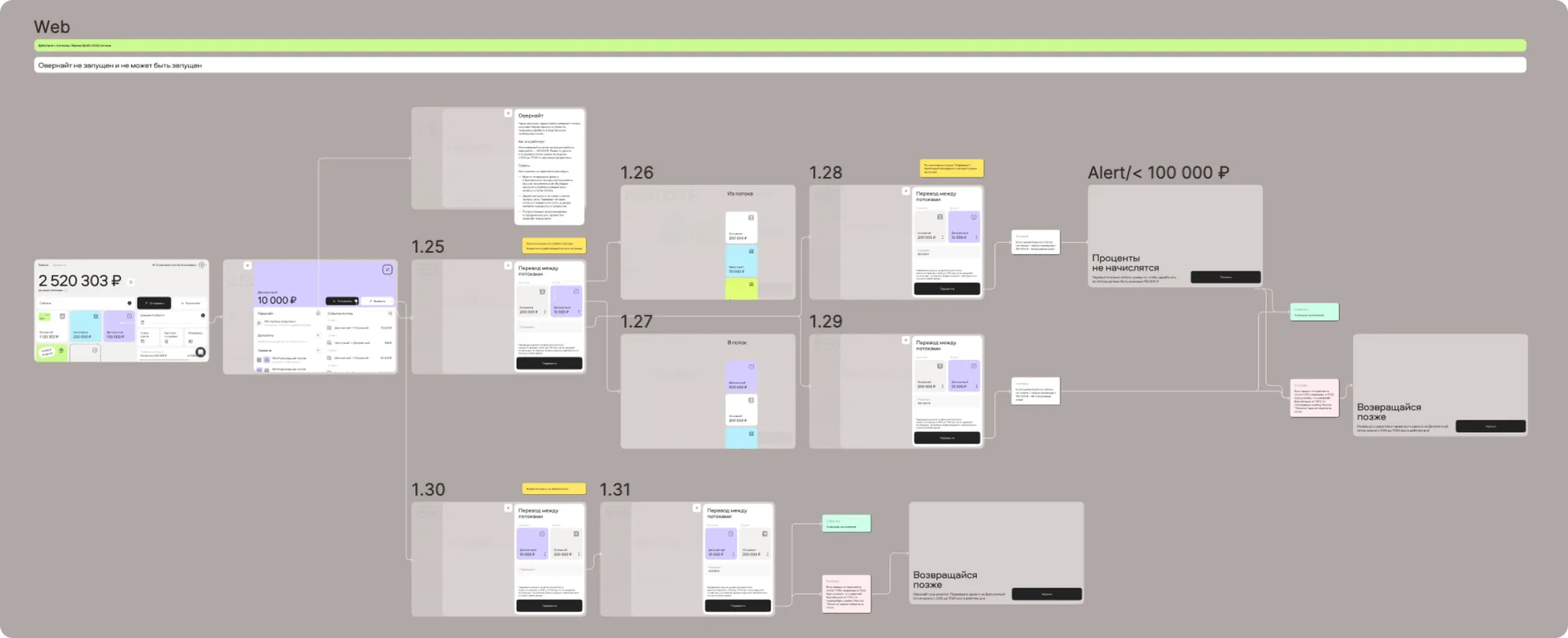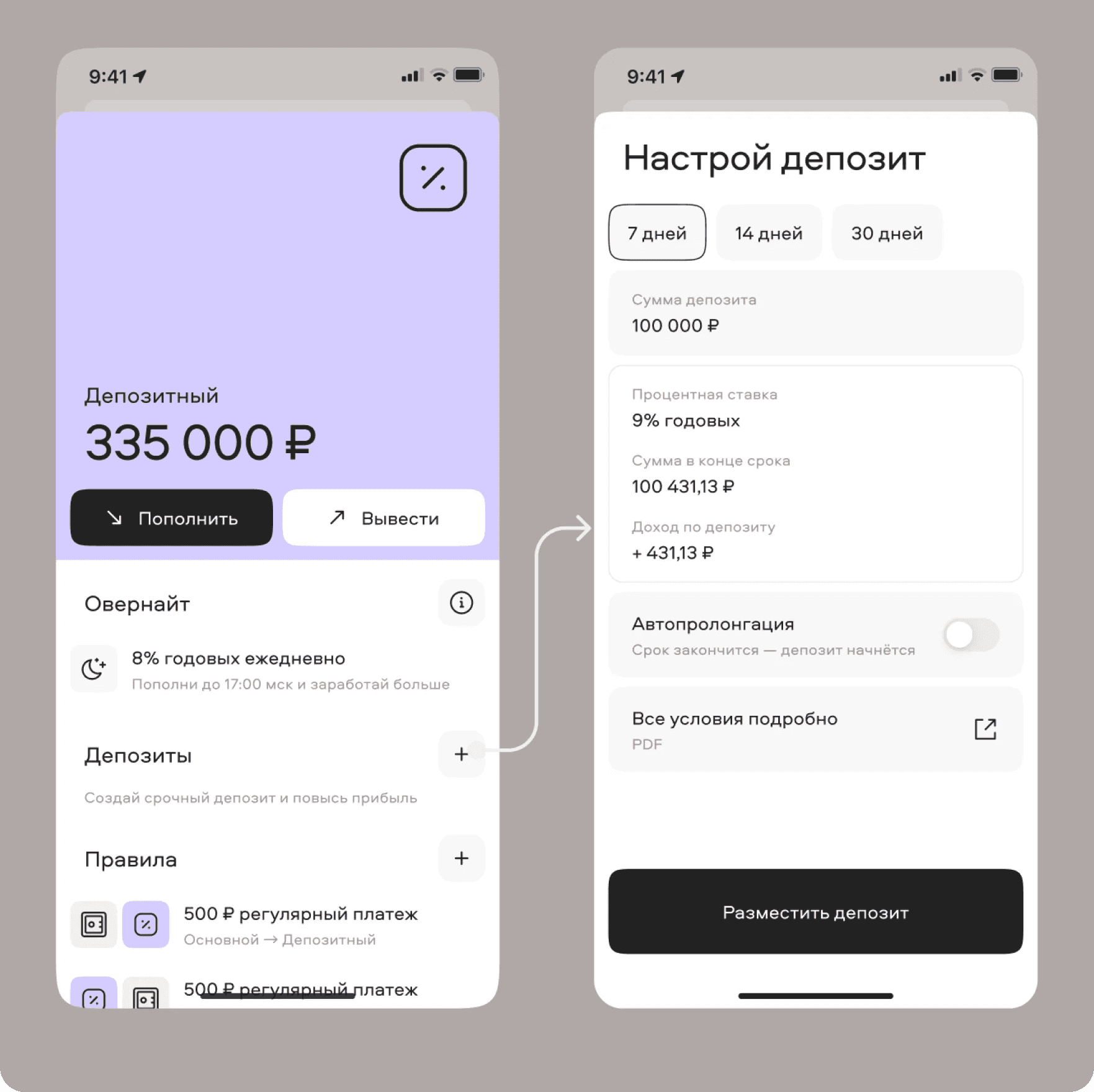 Within the “Streams” framework, I designed a new stream called “Deposit,” which automatically triggered the Overnight feature. This feature would activate if a stream held more than 100,000 rubles by 17:00 Moscow time, sending the balance to the exchange to earn interest overnight. This process was visually communicated to the user through a status called “Money is placed.” Users could withdraw or deposit money again after the overnight process completed at 5:00 AM the following day.