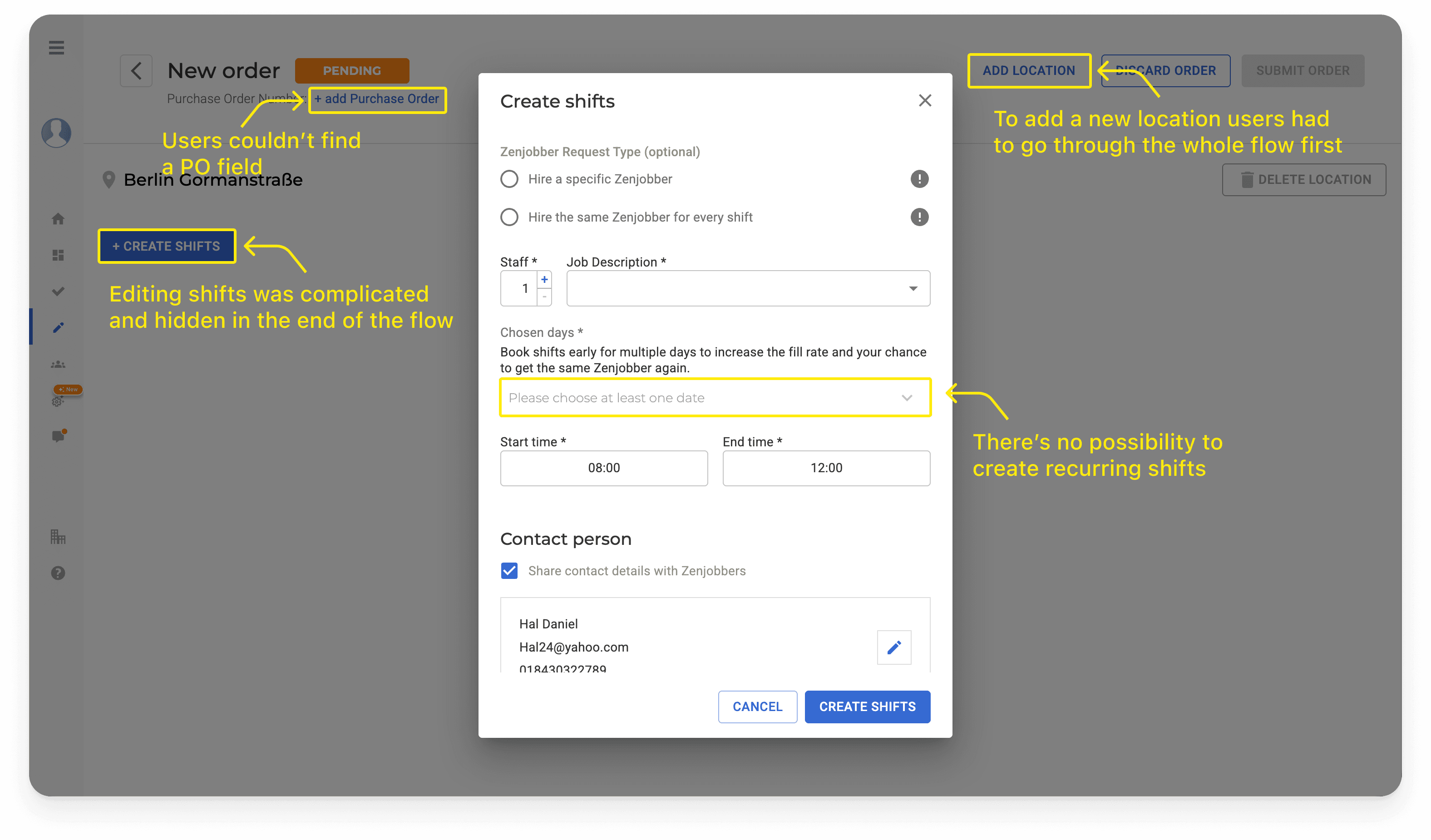 This led me to thinking: even though one segment of our customers actually had the need in long-term staffing, our system was outdated and had extremely poor usability. It also wasn’t built for multi-week or recurring scheduling. Each order was placed individually, creating friction. Customers clearly weren't aware if creating bigger orders would bring any value.