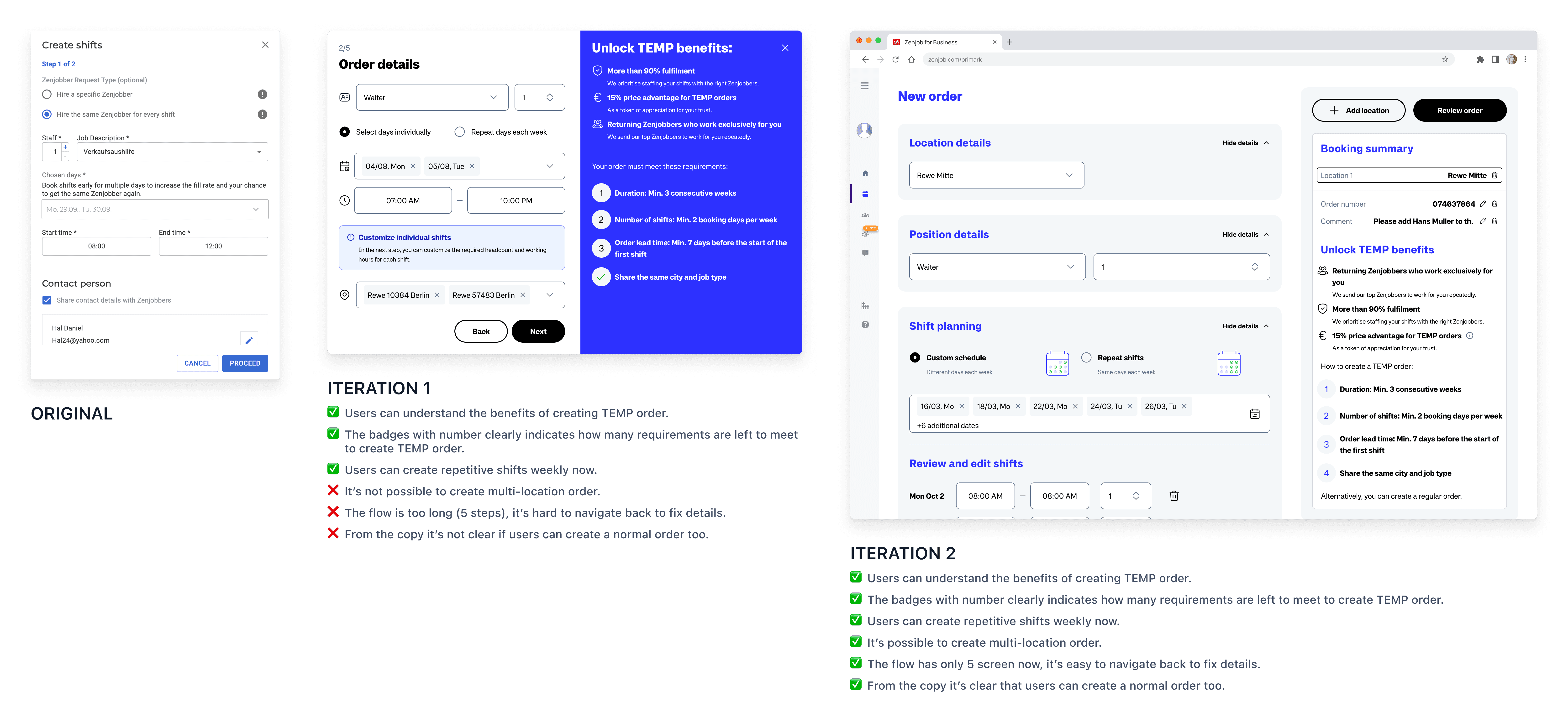 Automatic booking preference: once qualified, users saw “You’ve unlocked TEMP benefits, returning Zenjobbers will be prioritized.”